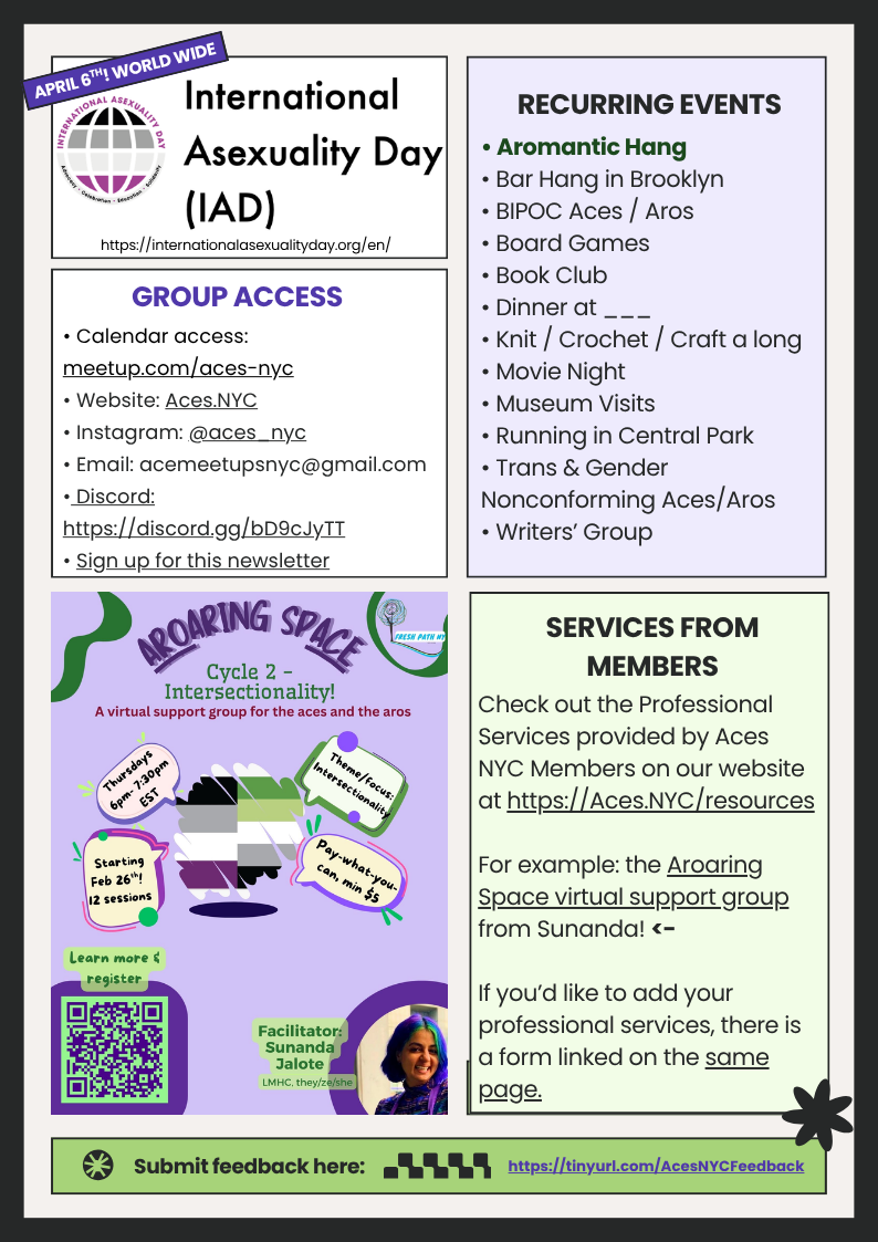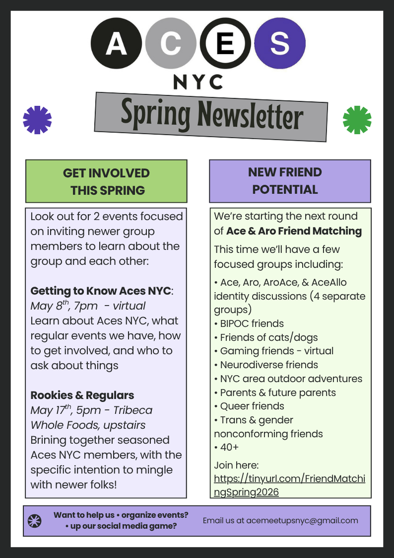 Aces NYC is a group of asexual people and allies who like to get together in person in and around New York City.